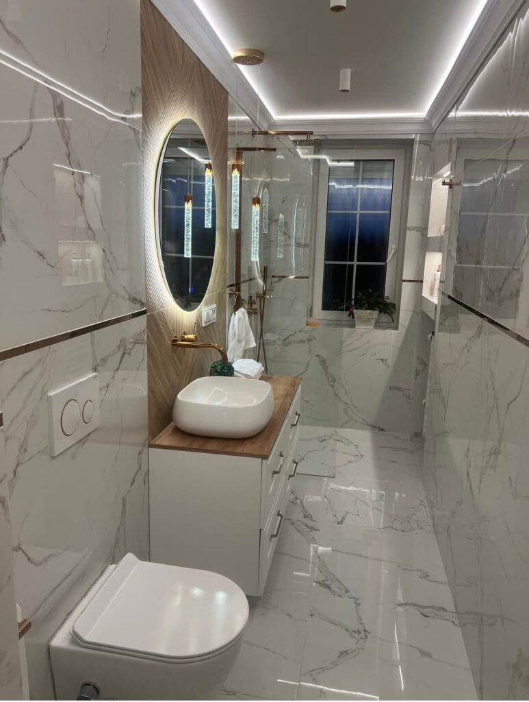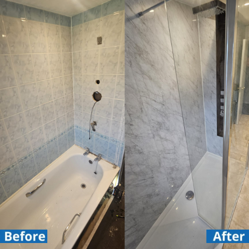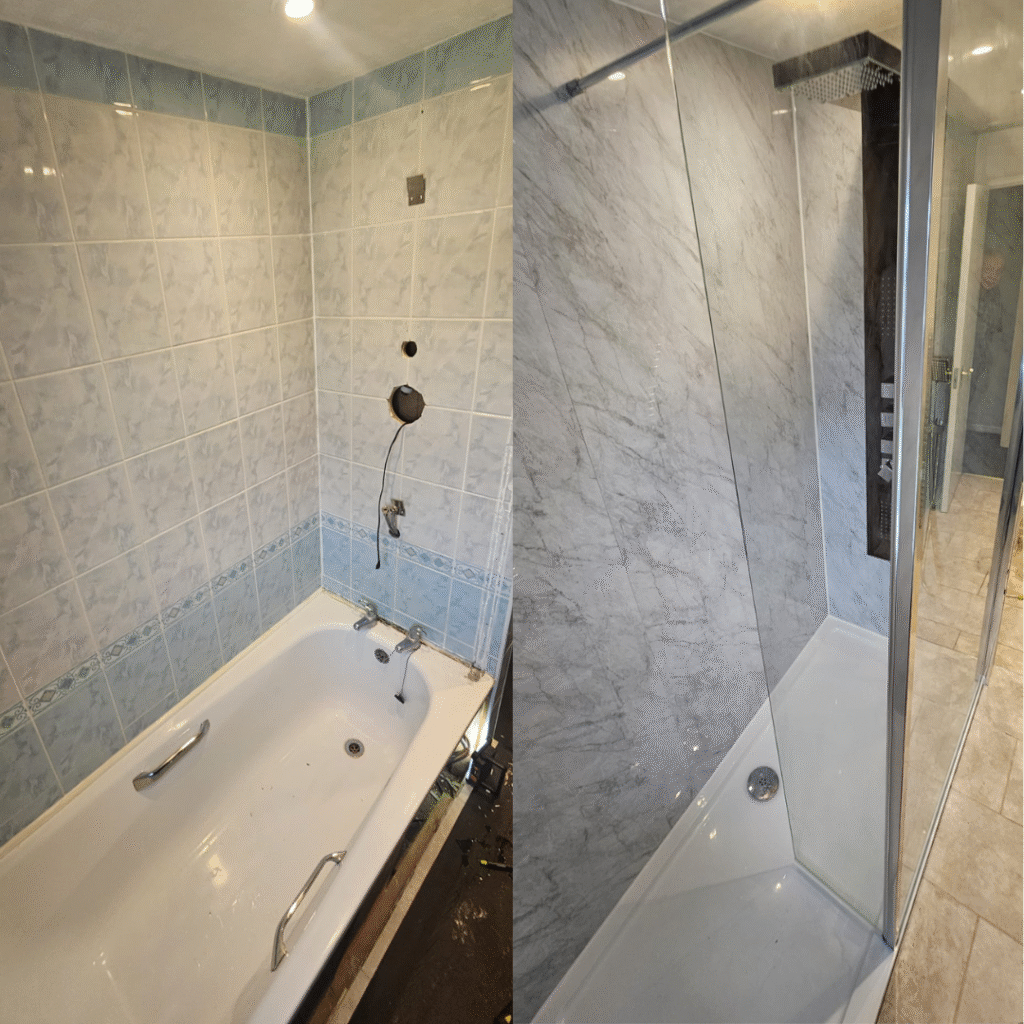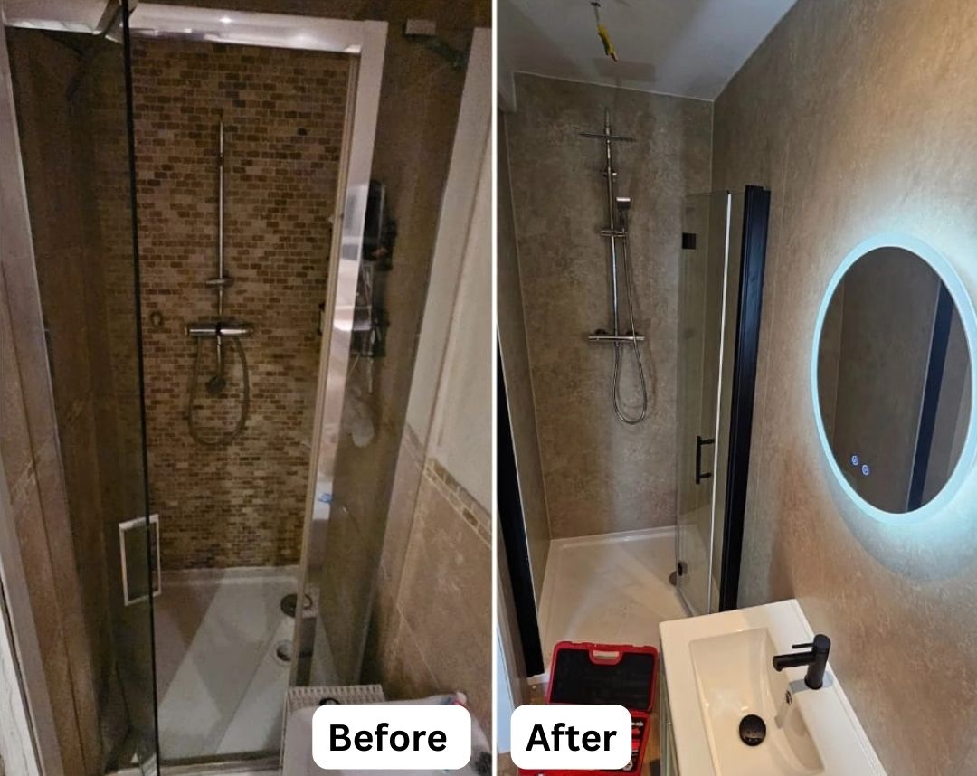Complete transformations including plumbing, tiling, panels, lighting and full installation.
